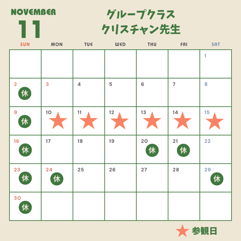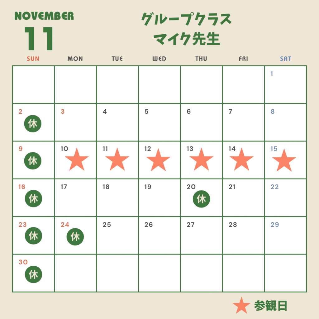 - クリスチャン先生とマイク先生のお休みが異なりますのでご注意ください。