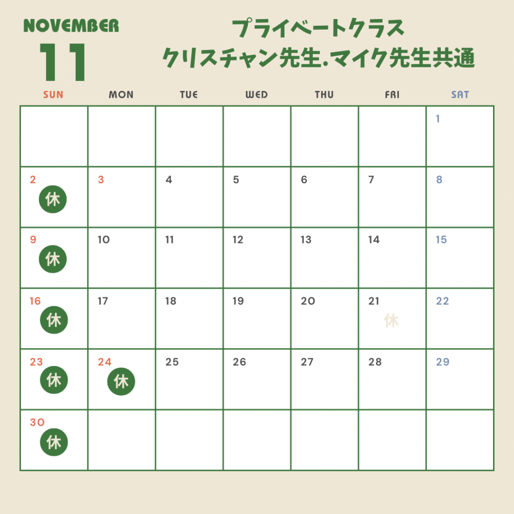 クリスチャン先生とマイク先生のお休みが異なりますのでご注意ください。